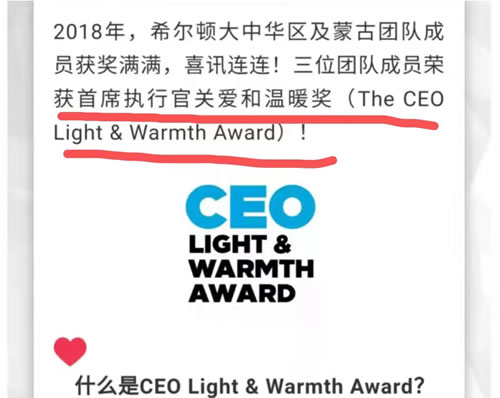 該員工獲得了希爾頓集團首席執(zhí)行官“關(guān)愛與溫暖獎”